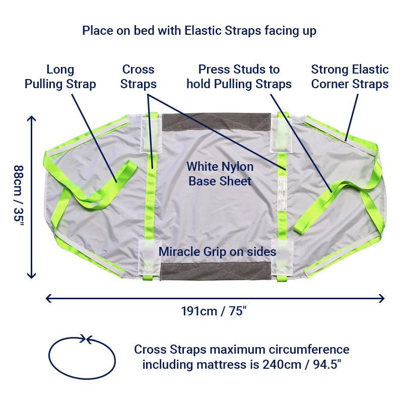 Rubber material sewn on each side. This helps prevent the mattress from slipping when someone gets into or out of bed. When the ResQsheet is in use, the sides of the mattress are lifted up when the Cross Straps are fastened so that the rubber is not in contact with the bed frame or floor. |